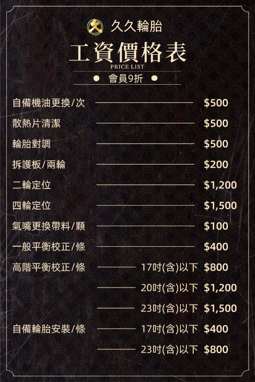 久久的代工費用皆依施工項目公開計算,如遇額外耗材或工時,將於施工前告知確認。久久輪胎以專業與誠信為原則,所有費用清楚透明。