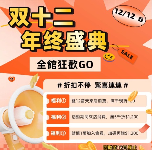 福利1雙12當天來店消費,滿千現折120